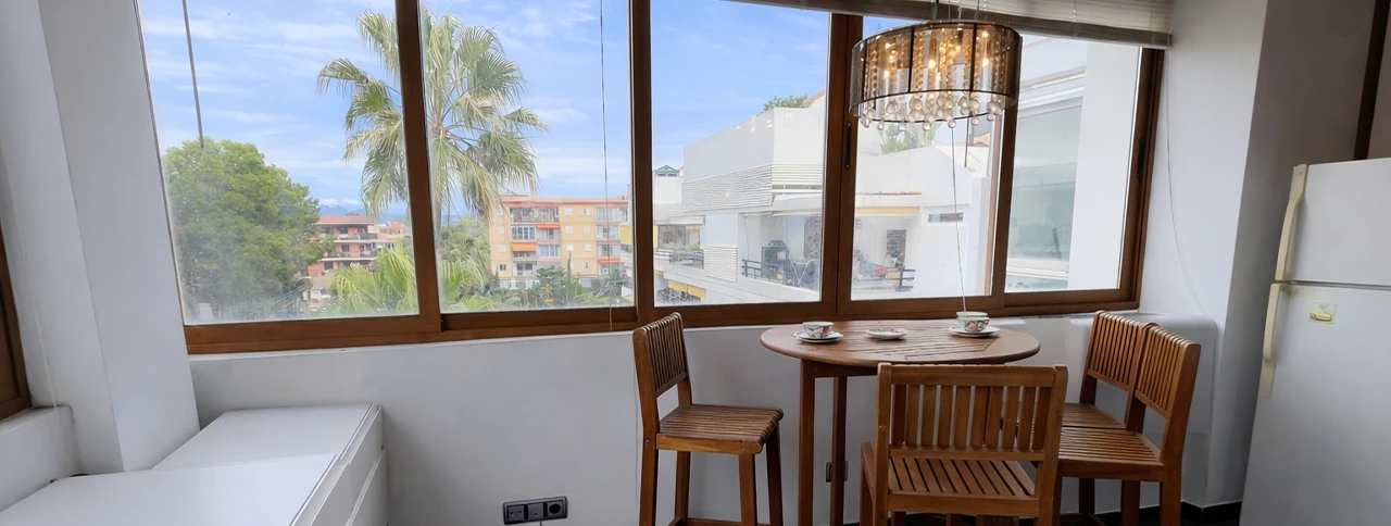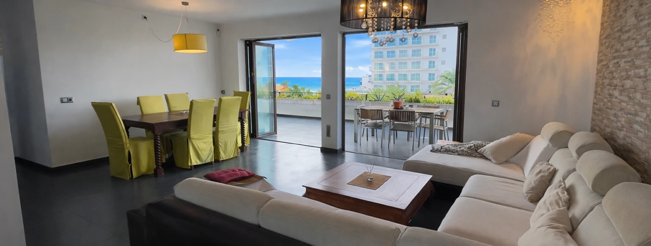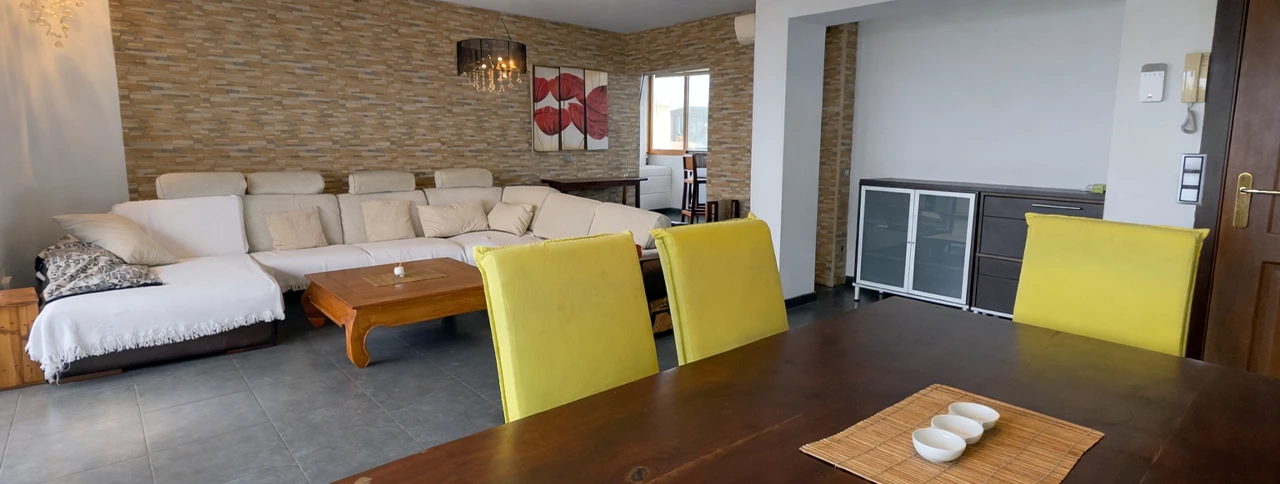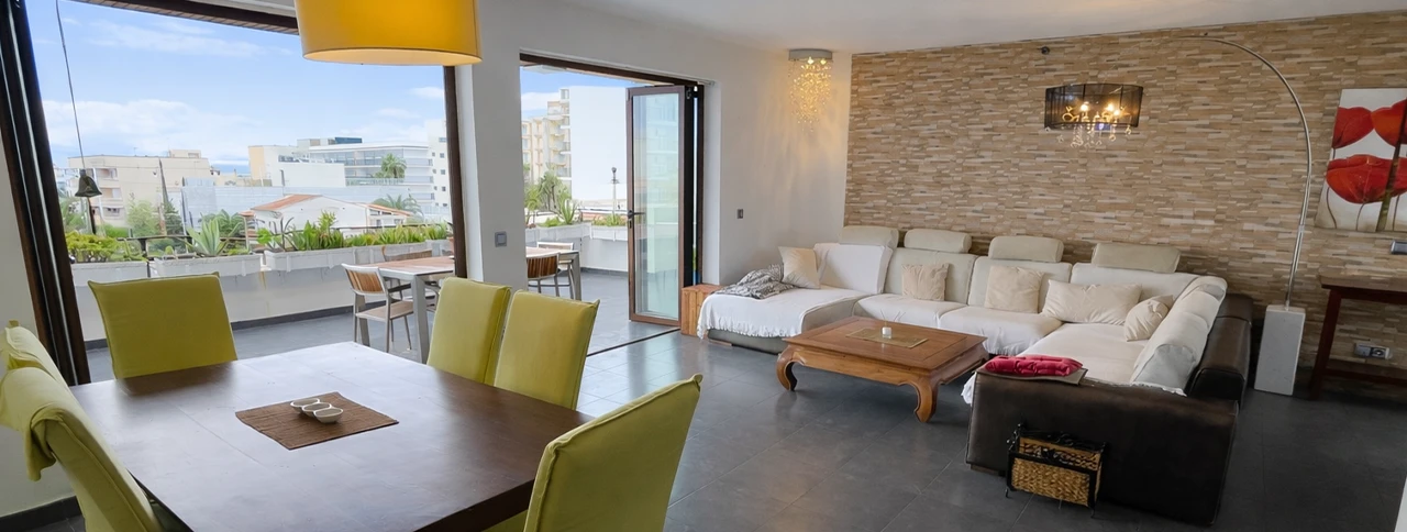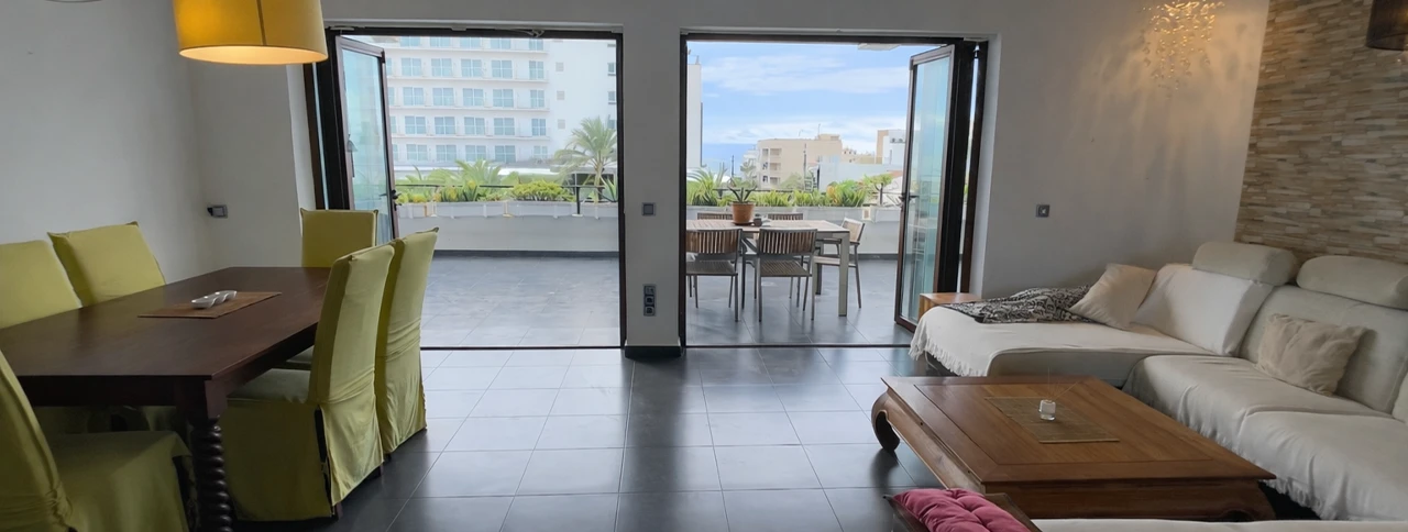 La distribución del apartamento ha sido diseñada para ofrecer una sensación de amplitud, luminosidad y estilo mediterráneo. El salón-comedor se conecta directamente con la terraza principal, creando una transición natural entre el confort interior y la vida al aire libre. La luz natural recorre toda la vivienda, generando un ambiente relajado y acogedor, ideal para desayunos prolongados, tardes tranquilas y veladas que se extienden hacia el exterior.