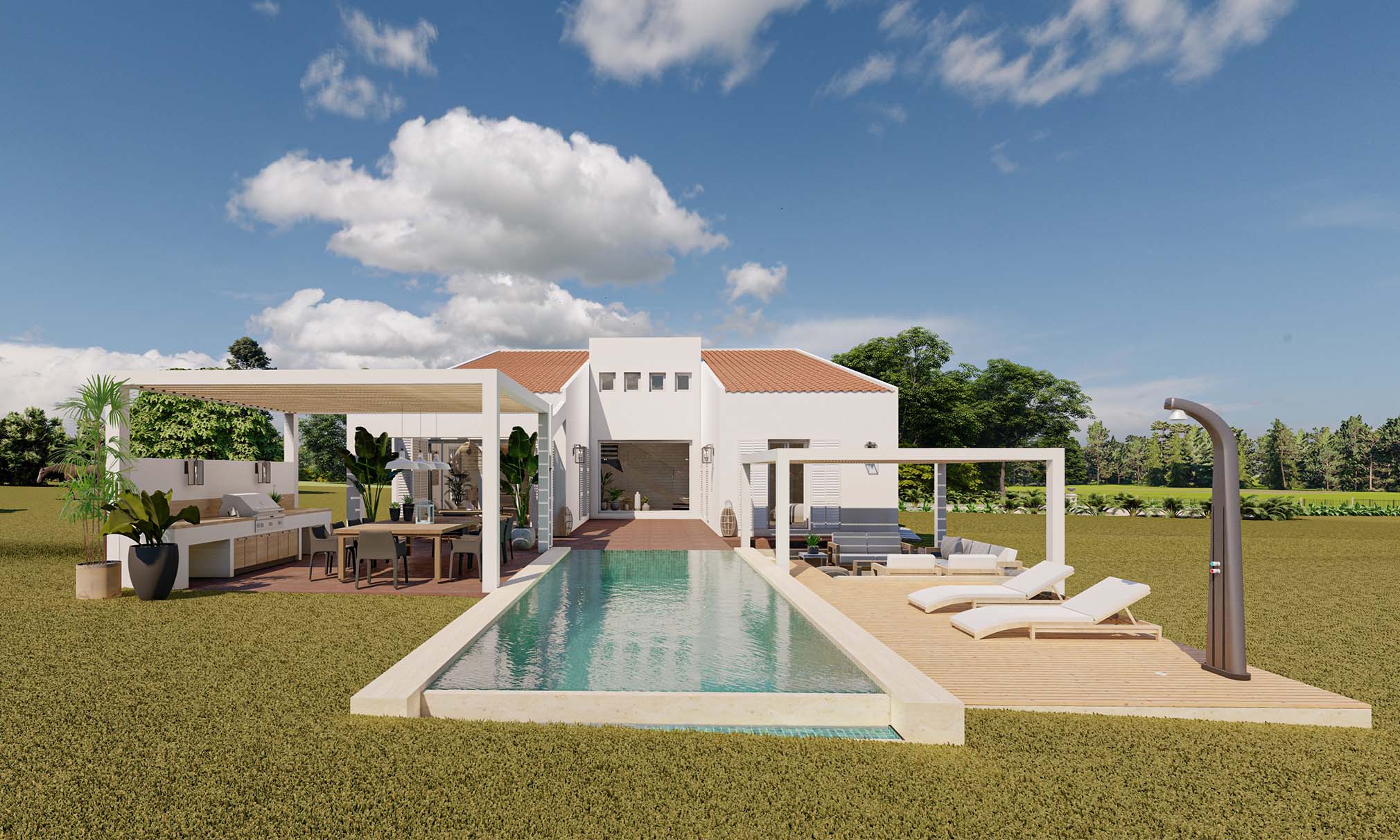 This luxury finca project in Montuïri includes a detailed plan for a large outdoor pool—perfect for relaxing and enjoying the surroundings. The design proposes a rectangular pool of 35 m² and a separate equipment room. Current regulations also allow future expansion options, in which the living area could almost be doubled—ideal for building a padel, tennis, or basketball court. Furthermore, a sustainable fruit and vegetable garden can be created, perfect for anyone pursuing an eco-friendly lifestyle in Mallorca.