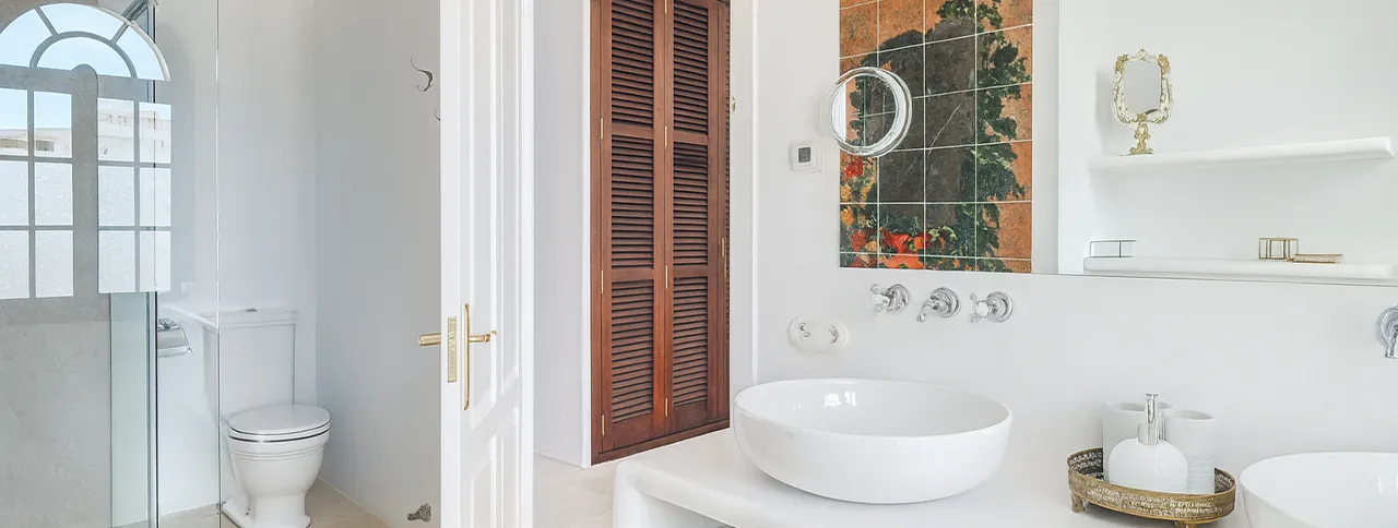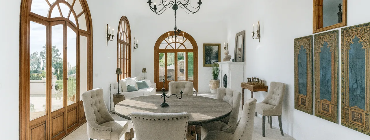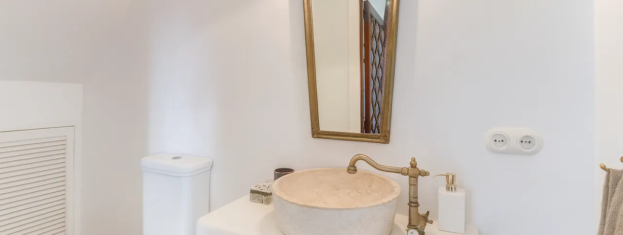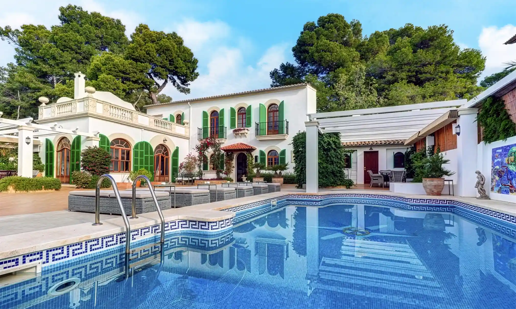 The villa includes five bedrooms, each styled with a blend of traditional Mallorquin features and contemporary luxury. Wooden accents, soft color palettes and a gentle flow of natural light create a calm and elegant atmosphere. With four bathrooms and an additional guest toilet, the layout ensures comfort throughout the home.