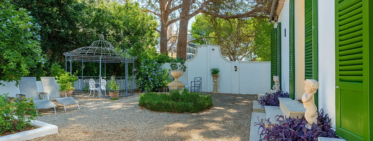 Beyond the pool terrace, the property unfolds further into multiple beautifully designed outdoor spaces. At the rear of the villa lies another serene garden area with a green lawn and a charming pergola, ideal for relaxing in the shade or enjoying quiet moments. On the lower level, near the large garage and driveway, additional comfortable seating corners create inviting retreat spots. These areas provide even more privacy and flexibility, making the property especially appealing for those who value outdoor lifestyle.