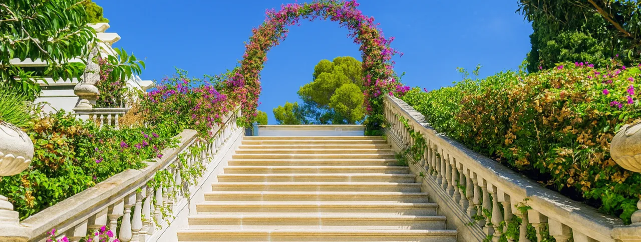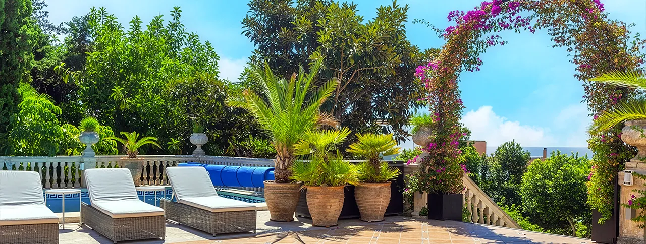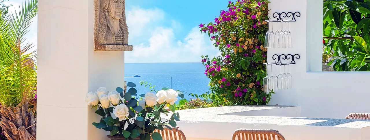 The approach to the villa sets the tone immediately: a charming staircase framed by a lush flowering archway creates an enchanting entrance. Upon reaching the main terrace level, the outdoor living areas open widely. To the right, a heated pool with sunny lounging zones invites year-round enjoyment. To the left, a dedicated pool bar and BBQ area, complemented by abundant seating and a large dining table, offer the perfect setting for gatherings with family and friends.